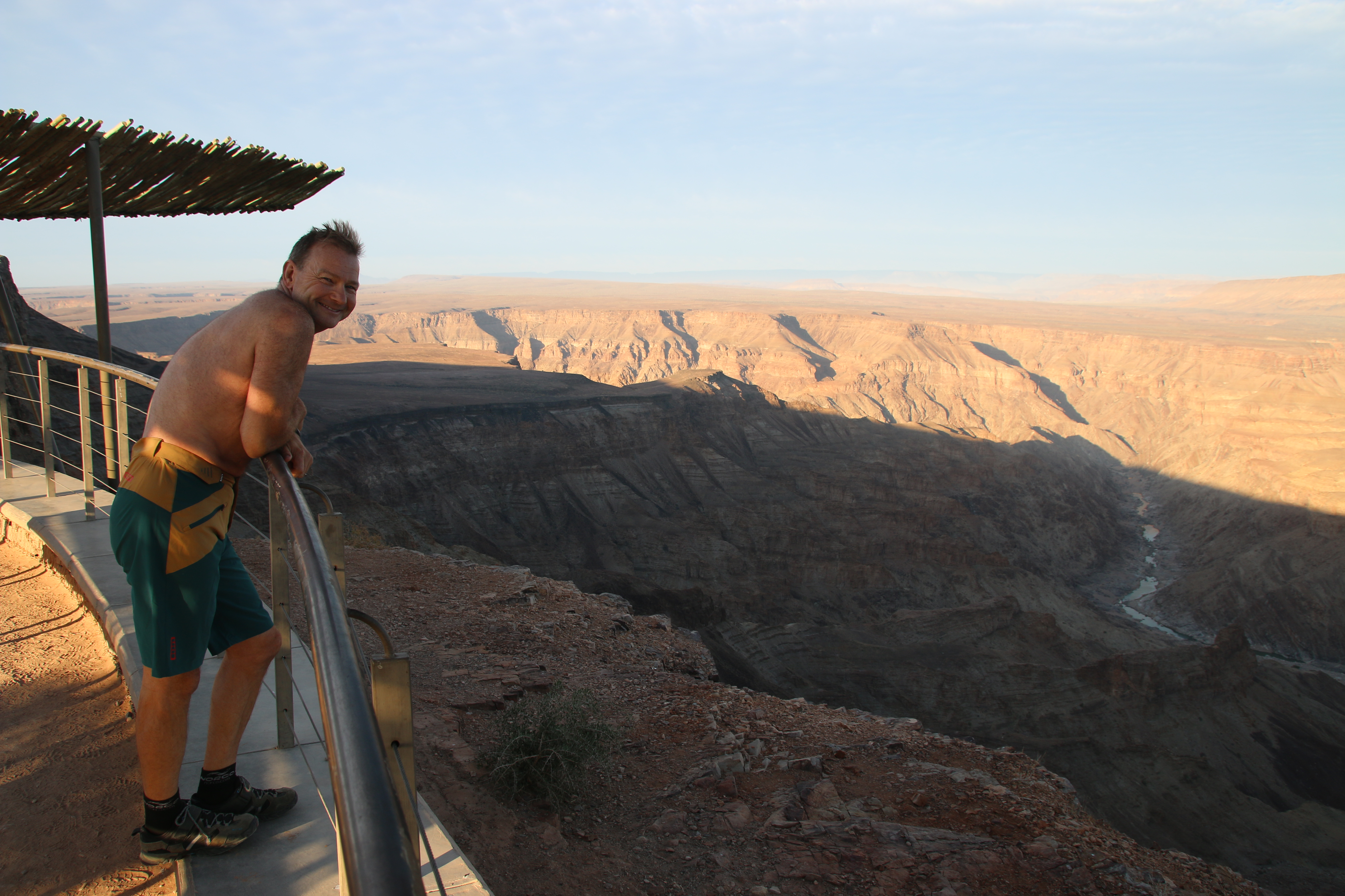 From the Richtersveld we travelled to the Fish River Canyon, the second largest canyon to that large American one people often talk about. This is where we learnt another of our valuable African lessons. When the road sign says 45km or even 10kms to your destination that doesn’t mean it’s accurate! A bit like road maps, these too are guides and not gospel! The lesson was received when Kevin and I saw the road sign to the canyon lookout point was ONLY 10kms from the campsite so early the following morning we mounted our bicycles and headed out. We didn’t quite beat the sun rise but we were the only people there. In fairness the views were spectacular and so was the silence and the road back also seemed shorter but that could have been to do with the fact it was downhill all the way!