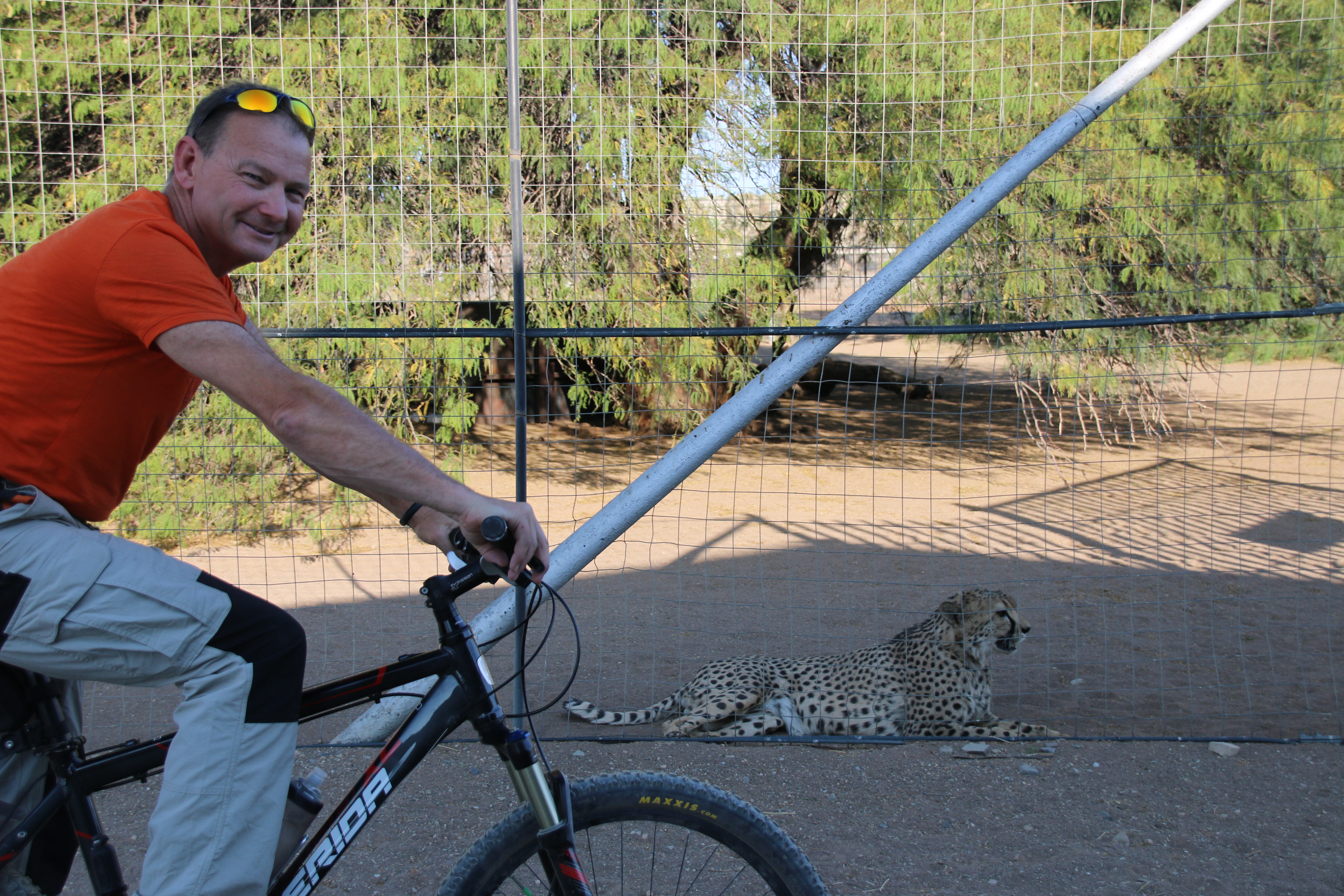 The cheetah chase – Where we were staying was also a sanctuary for cheetah’s though we had not seen them on arrival and were told to come back at 5pm for the evening feed! So with some time to spare Kevin and I had poodled to the pool on our bikes without incident and on the way back as we rounded a corner rather close to a farm fence out of the corner of my eye I saw something chasing me – thank god for that fence. Though needless to say I looked akin to road runner. Apparently the cheetah was just ‘playing’ and it wasn’t a real charge – lets hope next time that happens I am in the car! (we went back for photo’s once our heart rates had returned to normal and we had stopped laughing at ourselves)